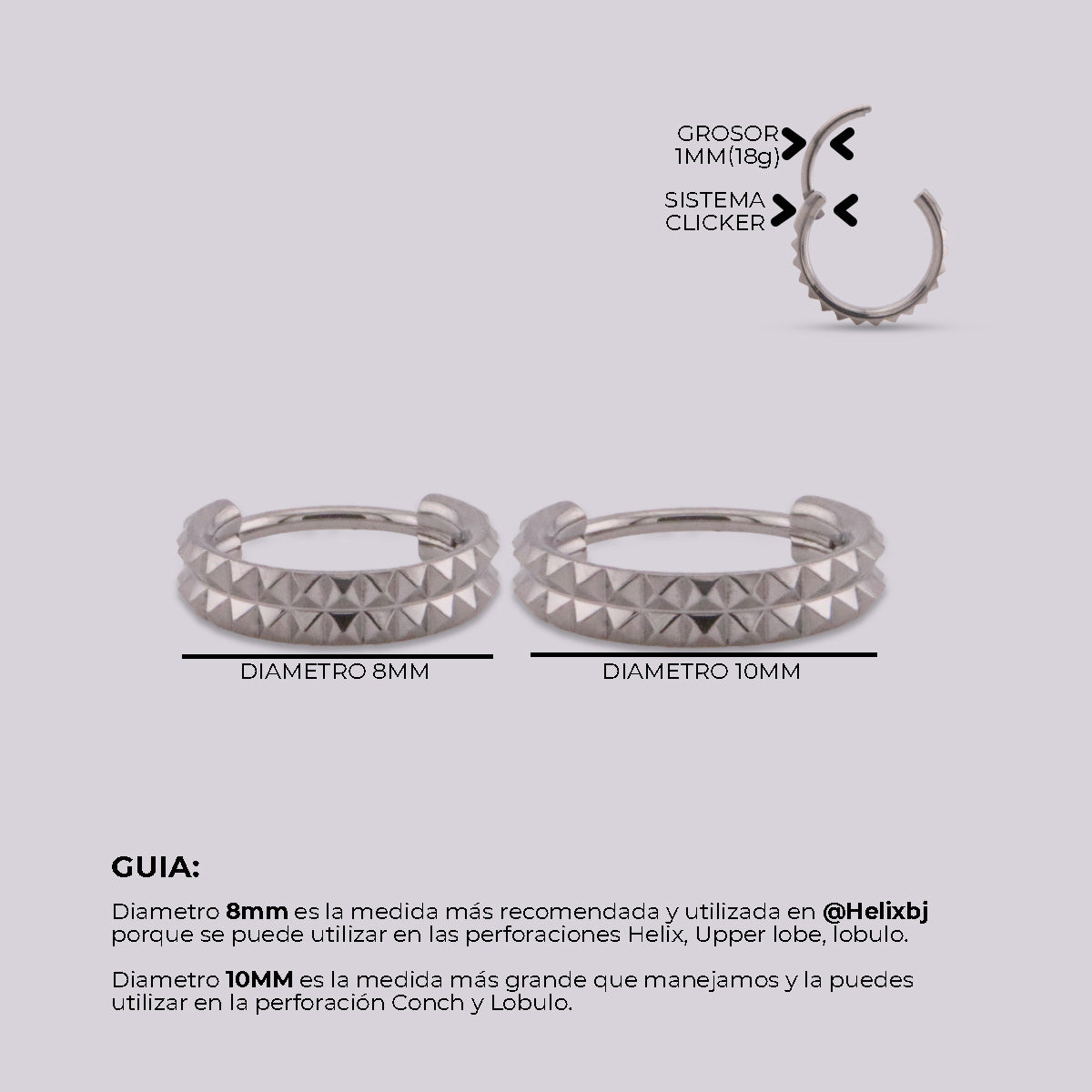 Incluye los calibres, largos y diámetros más utilizados en piercings de oreja, nariz, ombligo y pezón dentro de la experiencia comercial de Helix.