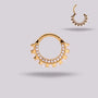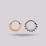 El Aro Clicker Radiance en Titanio es una joya protagonista diseñada para resaltar con brillo elegante y precisión técnica. Elaborado en titanio grado implante ASTM F-136, incorpora una línea frontal de zirconias claras de alto brillo que enmarcan la perforación y aportan un efecto luminoso sofisticado, ideal para composiciones modernas y editoriales.