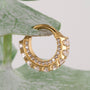 Para conservar tu joya en óptimas condiciones, límpiala regularmente con solución salina estéril. Se recomienda evitar el contacto prolongado con agua de piscina o mar para preservar el acabado de la pieza.